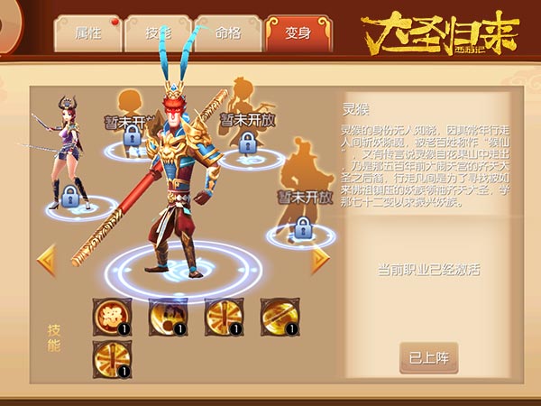 玩家们除了可以带领三界精英挑战各路妖魔,还可以在《大圣归来手游》中尽情体验“变身”玩法带来的全职业畅玩快感。在《大圣归来手游》中玩家们在进入游戏的初期,初始职业为灵猴,但这并是非玩家们可体验的唯一职业。随着玩家等级和综合实力的提高,玩家可通过变身,切换使用其他职业,体验一角色多职业的趣味。