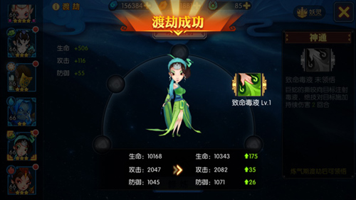 当伙伴培养到一定等级,就可以通过消耗境界点对伙伴进行修炼。每个伙伴完成第一阶段的修炼并且渡劫成功将领悟神通并获得属性加成;不同伙伴习得的神通不同,如小青的神通技能“致命毒液”可在每回合里对敌人造成更强的伤害,小翠的神通技能能使得自己在战斗中受到的伤害降低。玩家可根据自己的作战需求进行灵活培养,策略的应对不同的战斗。